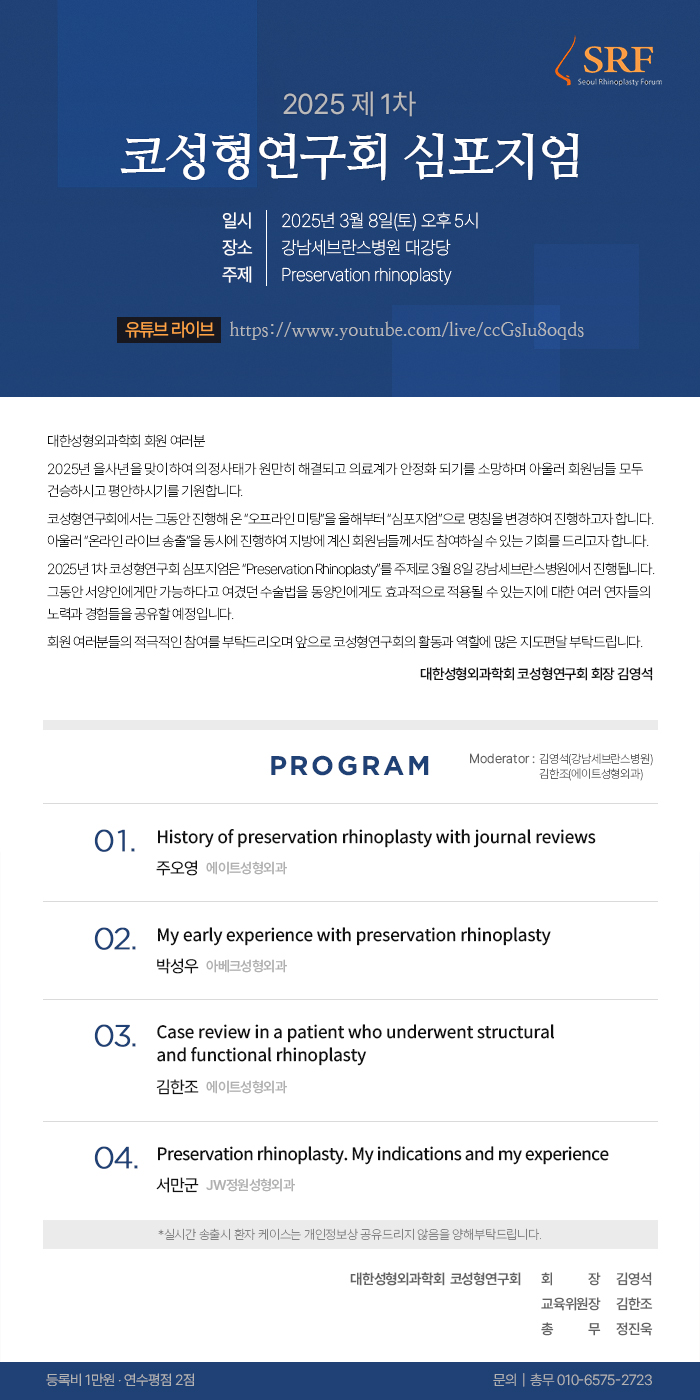 SRF | 2025 Seoul Rhinoplasty Forum 1st Symposium 페이지 정보 Writer SRF Date25-06-03 15:39 Views786 관련링크 본문 2025 Seoul Rhinoplasty Forum 1st Symposium Share Facebook Share Twitter Share Google+ List