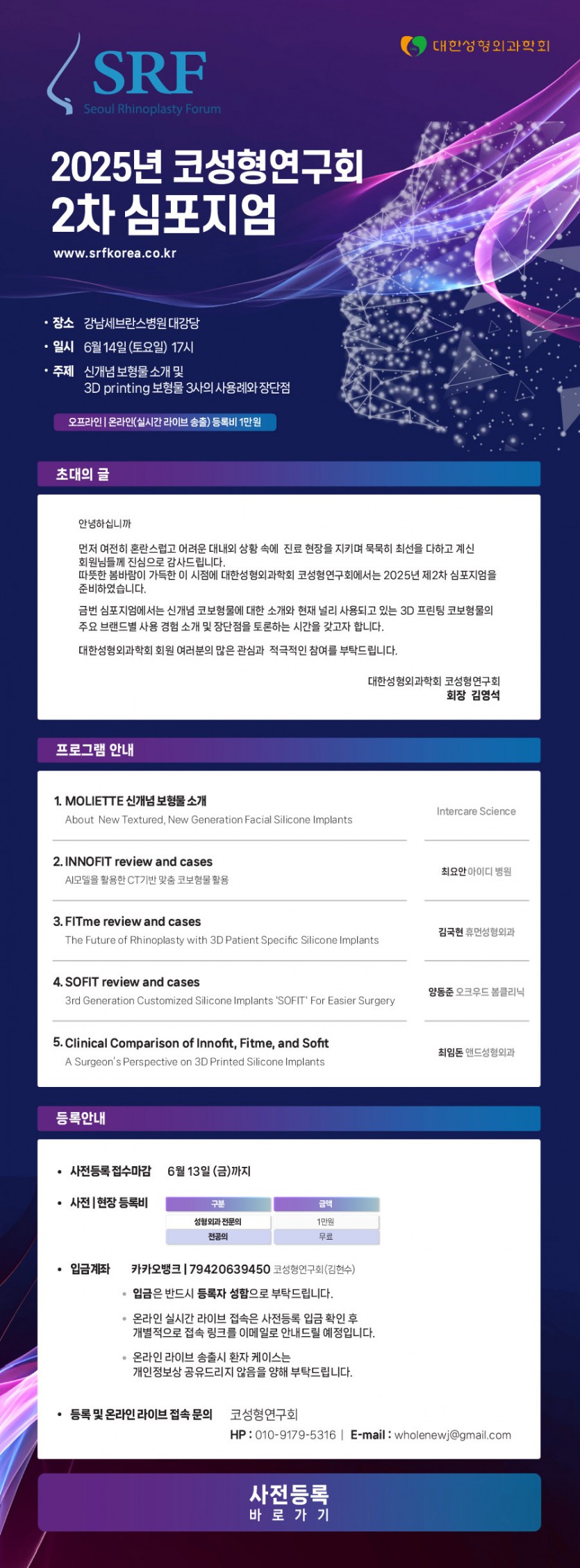 SRF | 2025 Seoul Rhinoplasty Forum 2st Symposium 페이지 정보 Writer SRF Date25-06-03 15:39 Views784 관련링크 본문 2025 Seoul Rhinoplasty Forum 2st Symposium Share Facebook Share Twitter Share Google+ List